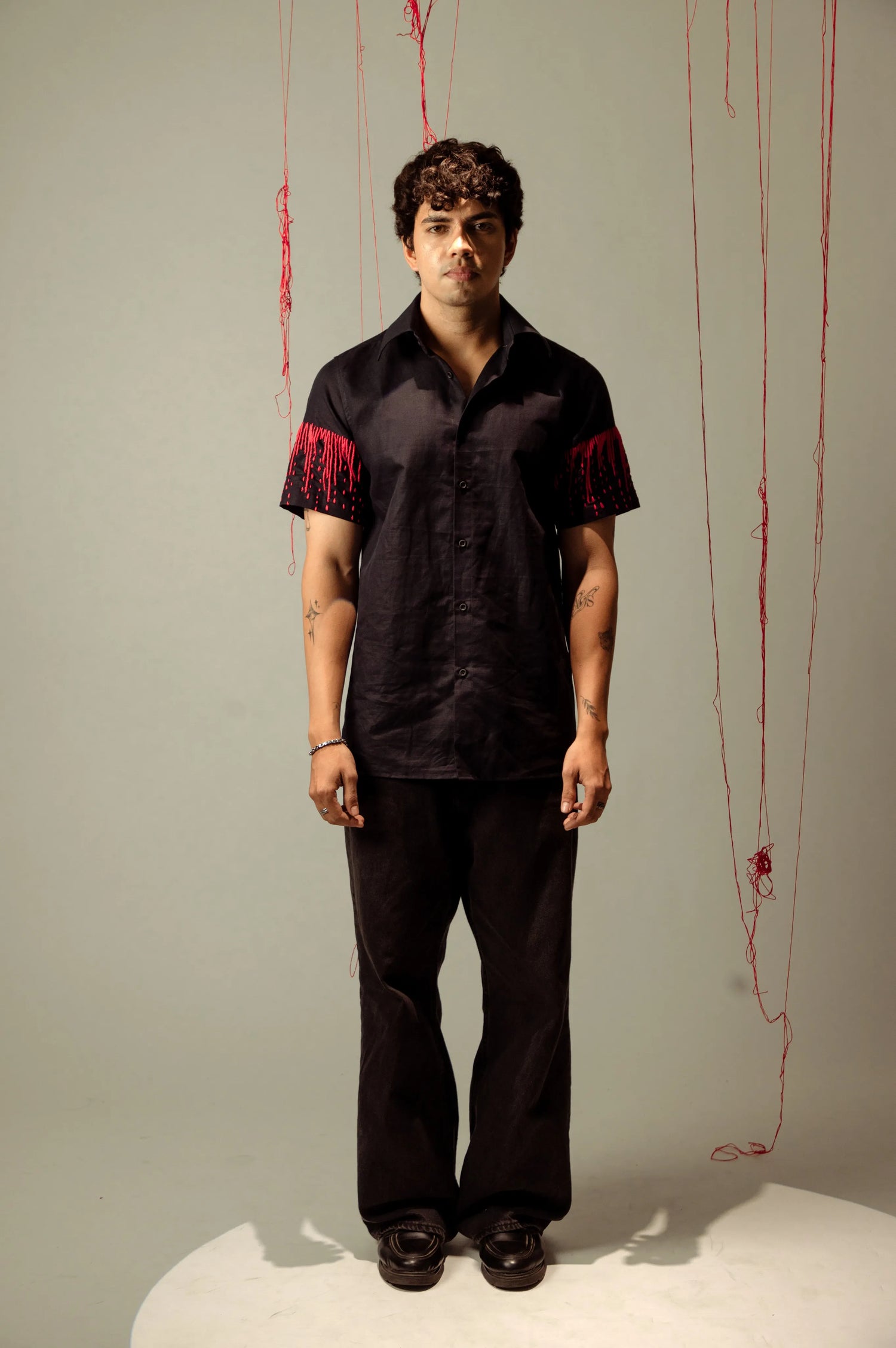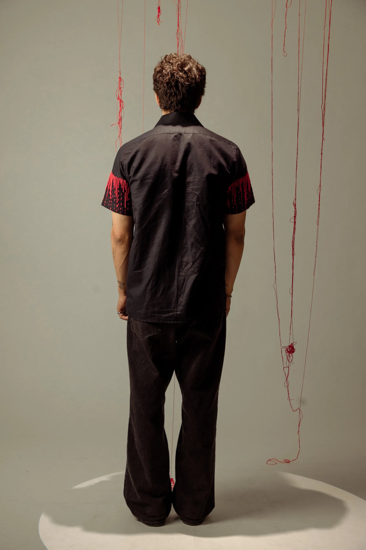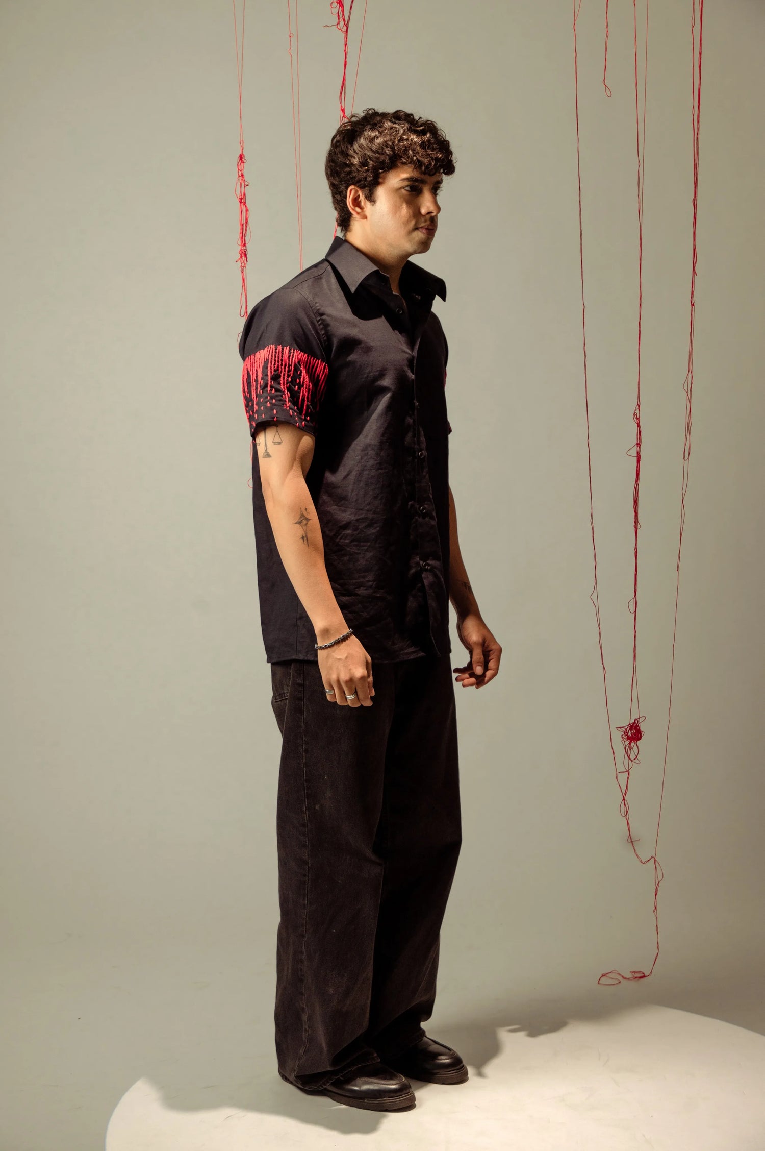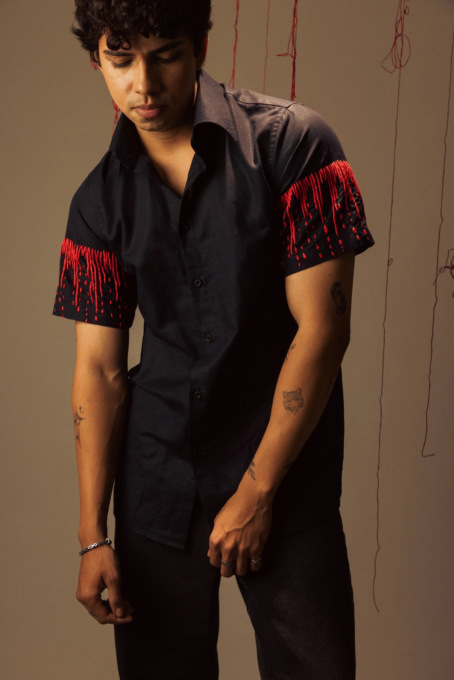 Description: A structured shirt featuring bold hand-threaded sleeve detailing that cascades like falling threads — capturing the raw motion and tension within entanglement.