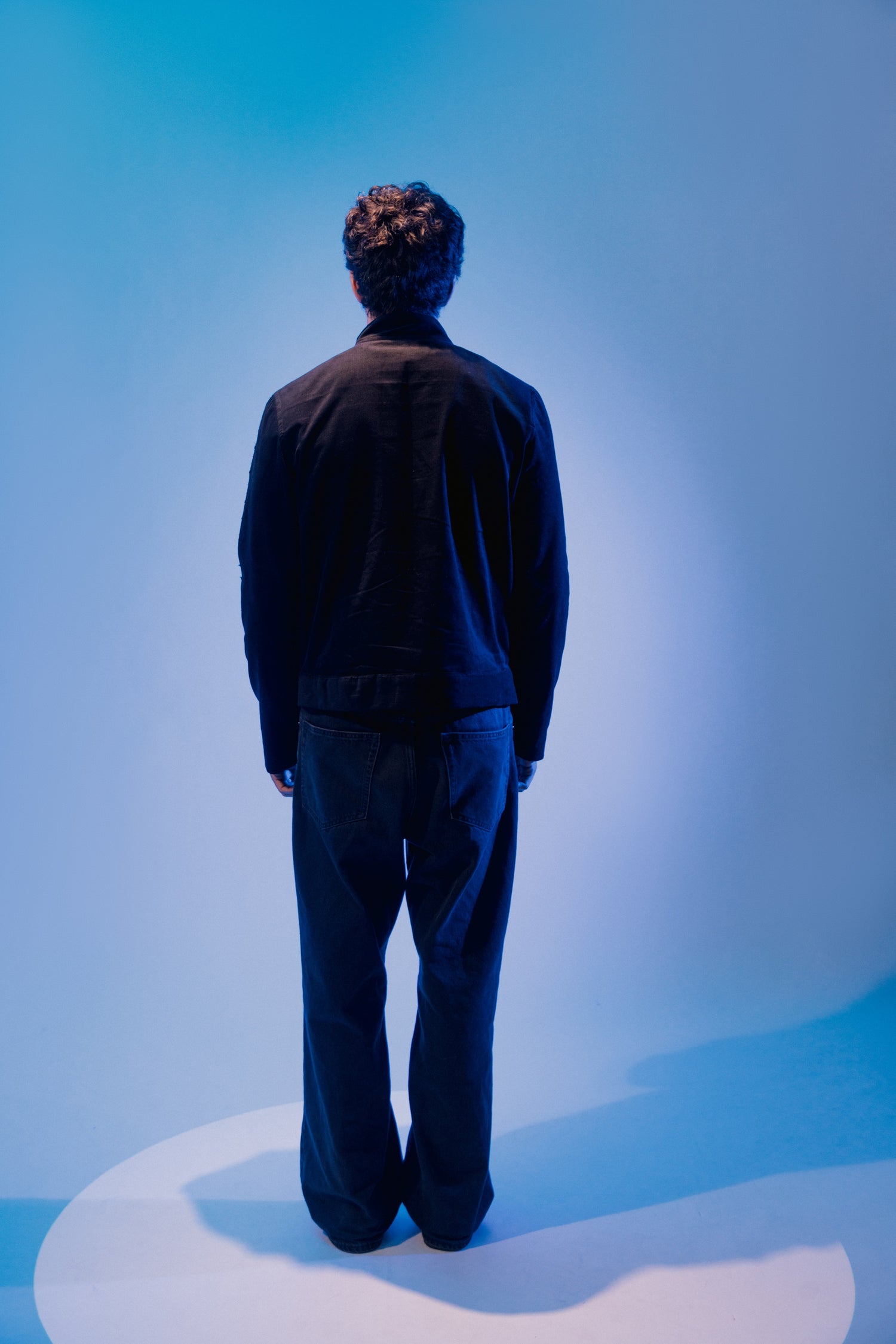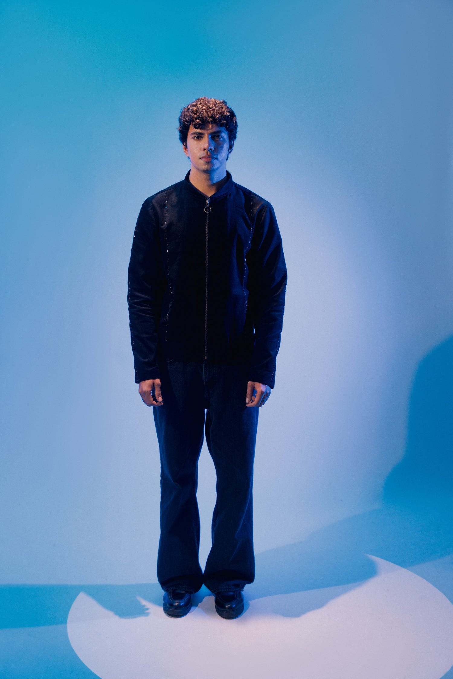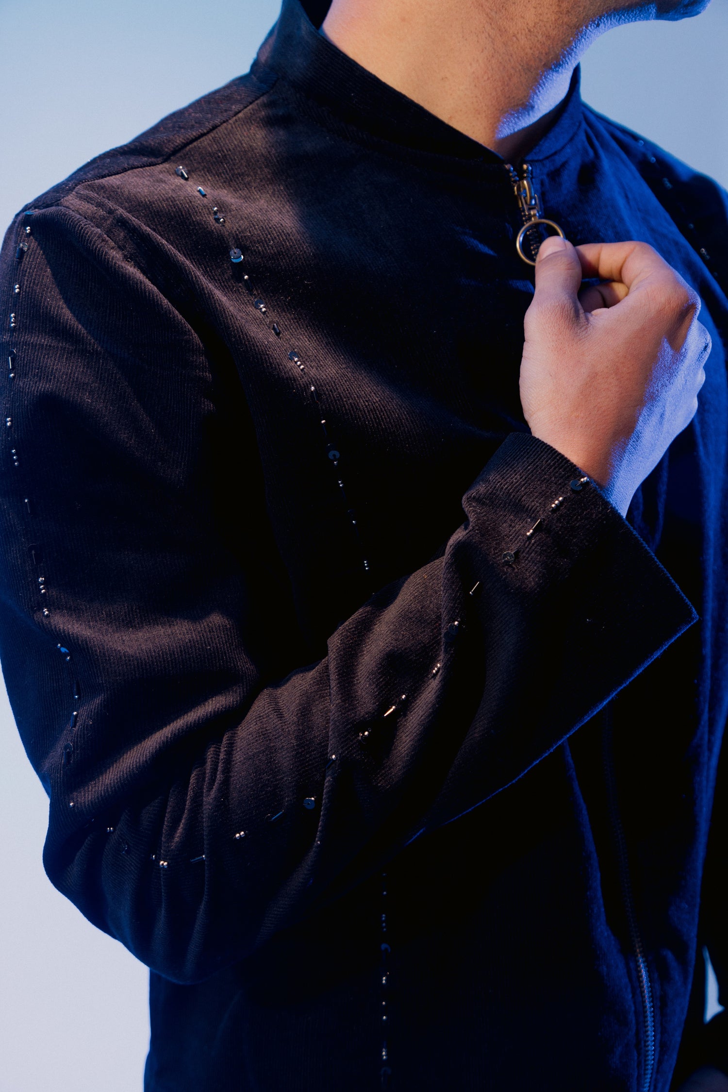 A structured black jacket elevated with subtle linear hand-embroided detailing, symbolizing the paths and marks left through every entanglement. Finished with a clean collar and front zip closure, the Trace Jacket merges refined tailoring with expressive craftsmanship.